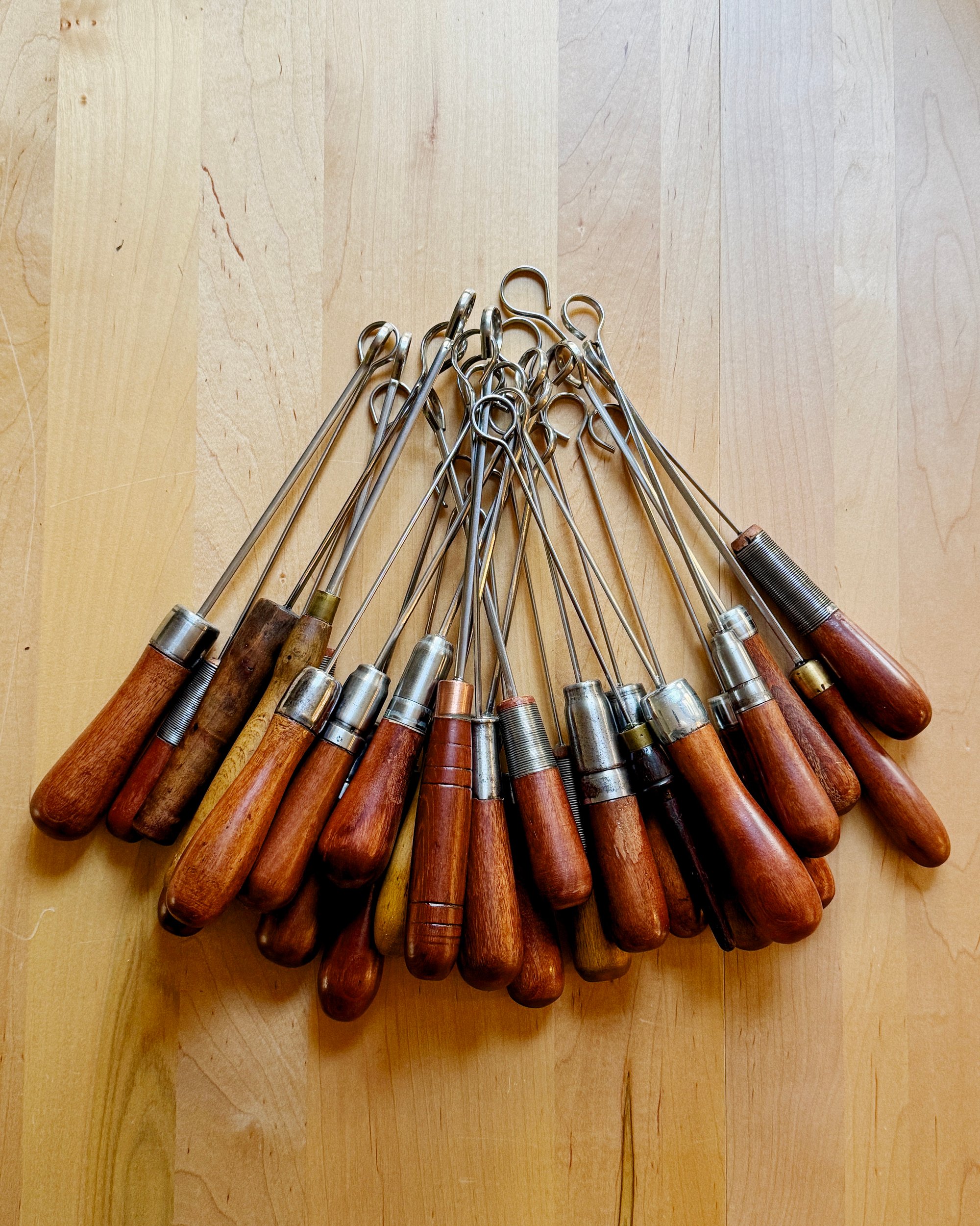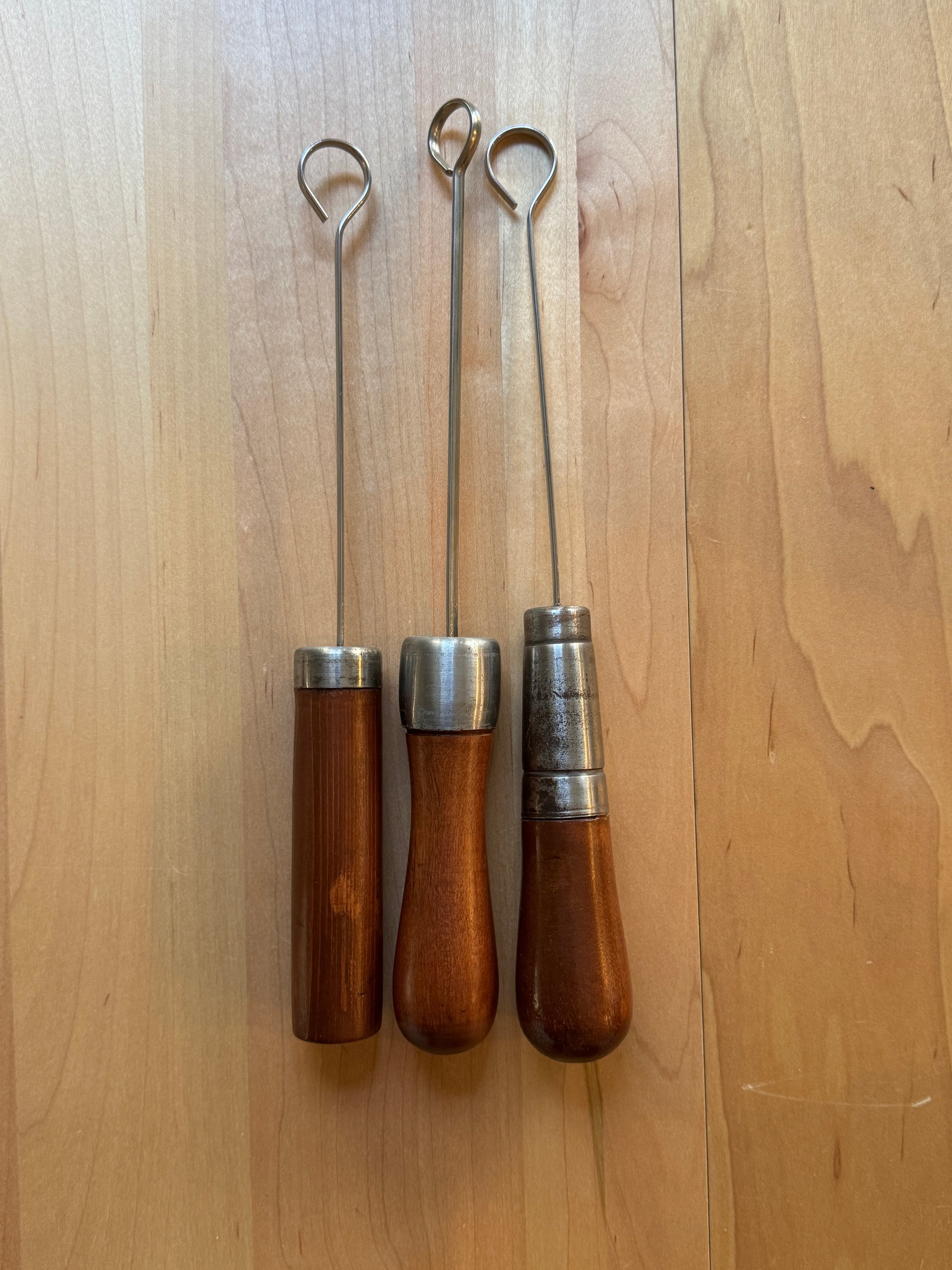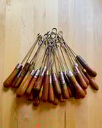 These are essentially mini dough whisks, perfect for stirring starters and preferments in small containers, made of stainless-steel and wood. They are about 10" long from end to end, and 6" long from handle to loop. Stop using spoons or chopsticks and switch to one of these instead! (They are also excellent for stirring tahini or peanut butter.)